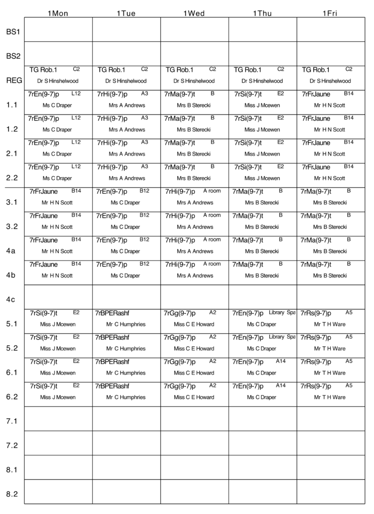 | Tue (Week 2) | Greek club | Classics | B9 | Lunch | Miss Legg | 8 9 |
